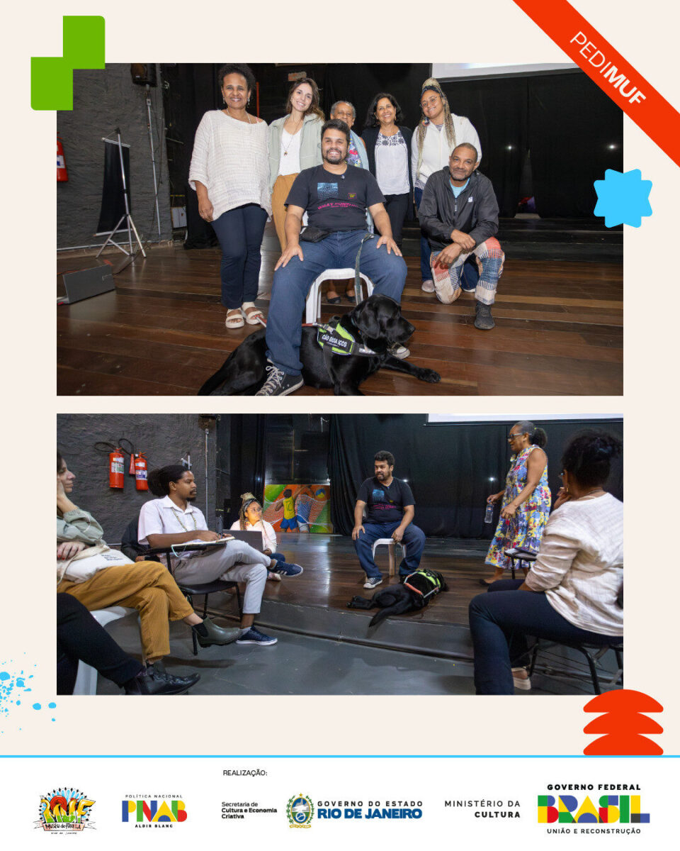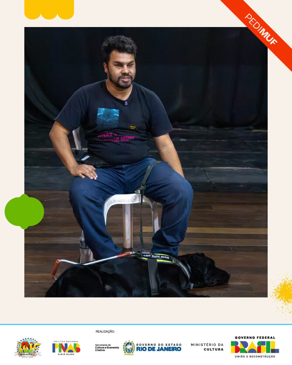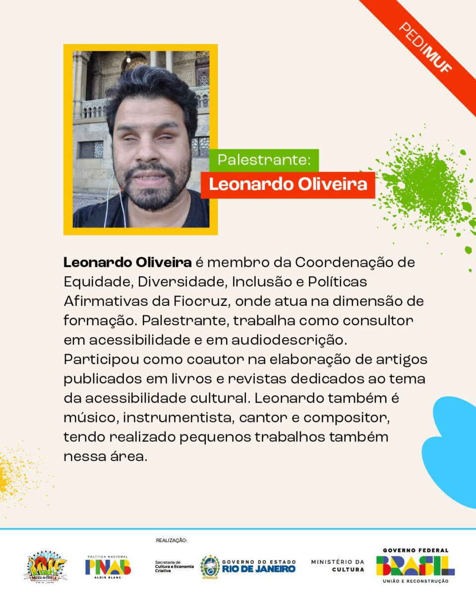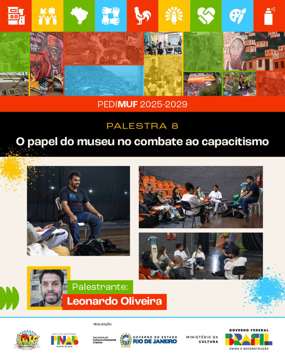 Audiodescrição de um Carrossel com quatro cards da Palestra ministrada por Leonardo Oliveira. Em todos, no rodapé, constam os logotipos do MUF- Museu de Favela, da PNAB- Política Nacional Aldir Blanc, e das instituições responsáveis pela realização: Secretaria de Cultura e Economia Criativa do Estado do Rio de Janeiro, Governo do Estado do Rio de Janeiro, Ministério da Cultura e Governo Federal: União e Reconstrução. 1- O cartaz é colorido, dividido em três blocos horizontais. No bloco superior há, uma faixa horizontal com 9 ícones quadrados coloridos: casas sobrepostas, três pessoas que aproximam duas peças de um quebra cabeça, o mapa do Brasil, mãos unidas que formam um quadrado, um galo, um pavão, mãos unidas formando um coração, uma aquarela e um spray de tinta. Abaixo há um mosaico com fotos coloridas do território do Pavão Pavãozinho e Cantagalo, casas-tela pintadas em grafite, quadros, ações no museu com pessoas e cenas urbanas. Abaixo, em uma faixa estreita vermelha em letras brancas, lê-se: PEDIMUF 2025 a 2029. No bloco central, há uma faixa preta. Em letras amarelas, lê-se: Palestra 8. Em letras brancas: O papel do museu no combate ao capacitismo. Abaixo, estão quatro fotos: 1- Fotografia de Leonardo sentado em uma cadeira plástica branca, sobre um palco com piso de madeira. Ele é um homem branco, de cabelos escuros, ondulados e volumosos, cego, barba curta e bigode pretos. Usa uma camiseta preta com estampa colorida na parte frontal e calça jeans azul. Exibe um sorriso discreto. Aos pés de Leonardo, está deitado um cão-guia. À frente, vê-se parcialmente outras pessoas sentadas. 2- Fotografia capturada à direita do palco, de oito pessoas sentadas em círculo no interior de um teatro. À esquerda, há fileiras de cadeiras fixas na cor laranja, dispostas em degraus, onde quatro pessoas estão sentadas. Mais ao centro, duas pessoas ocupam cadeiras de madeira, e à direita está Leonardo. Ao lado dele, vista parcialmente, está outra pessoa sentada no chão do palco. 3- Fotografia capturada de frente para o palco, mostrando o mesmo grupo retratado na imagem anterior. A pessoa sentada ao lado de Leonardo, está com a cabeça baixa e escreve em um notebook apoiado sobre as pernas. O espaço possui piso de madeira e fundo escuro. Na parede lateral esquerda, estão dois extintores de incêndio e um bebedouro alto de cor clara. 4-Na área inferior esquerda, está a foto do palestrante, visto dos ombros para cima. Ele usa uma camiseta preta e fones de ouvido brancos. Ao fundo, desfocada, está a fachada de um prédio histórico em pedra, com colunas brancas. À direita da foto, há duas faixas, uma verde e outra vermelha. Na faixa verde, em letras brancas, lê-se: Palestrante. Na vermelha, também em letras brancas: Leonardo Oliveira. 2- Sobre um fundo bege, há, na área superior direita e em diagonal, uma faixa vermelha onde se lê, em letras brancas: PEDIMUF. Abaixo, há duas fotografias dispostas verticalmente. A imagem superior retrata o grupo de oito pessoas posando sobre o palco. Ao centro, está Leonardo, sentado na cadeira plástica branca. À frente dele, o cão-guia preto está deitado. Atrás de Leonardo, cinco pessoas estão em pé, lado a lado, e outra está agachada, com o joelho direito apoiado no chão. Todos sorriem. Na fotografia inferior, o grupo está sentado. À direita, próxima a Leonardo, está uma senhora em pé. Ela usa um vestido estampado e segura uma garrafinha de água 3- Sobre um fundo bege, há, na área superior direita e em diagonal, uma faixa vermelha onde se lê, em letras brancas: PEDIMUF. Abaixo, está a fotografia de Leonardo, sentado na cadeira plástica branca, com a alça guia do cão preto apoiada sobre a coxa esquerda. 4- Sobre fundo bege, há, na área superior direita e em diagonal, uma faixa vermelha onde se lê, em letras brancas: PEDIMUF. À esquerda há a foto ao ar livre de Leonardo Oliveira que é visto do peito para cima. Leonardo é um homem branco, cabelos escuros, ondulados e volumosos, cego, barba curta e bigode pretos. Usa camisa preta e fones de ouvido brancos. Ao fundo, desfocada, está a fachada de um prédio histórico em pedra, com colunas brancas. À direita da foto, há duas faixas, uma verde e outra vermelha. Na faixa verde, em letras brancas, lê-se: Palestrante. Na vermelha, também em letras brancas: Leonardo Oliveira. Abaixo, lê-se: Leonardo Oliveira é membro da Coordenação de Equidade, Diversidade, Inclusão e Políticas Afirmativas da Fiocruz, onde atua na dimensão de formação. Palestrante, trabalha como consultor em acessibilidade e em audiodescrição. Participou como coautor na elaboração de artigos publicados em livros e revistas dedicados ao tema da acessibilidade cultural. Leonardo também é músico, instrumentista, cantor e compositor, tendo realizado pequenos trabalhos também nessa área. Fim da audiodescrição. |