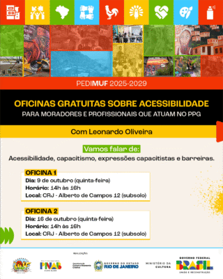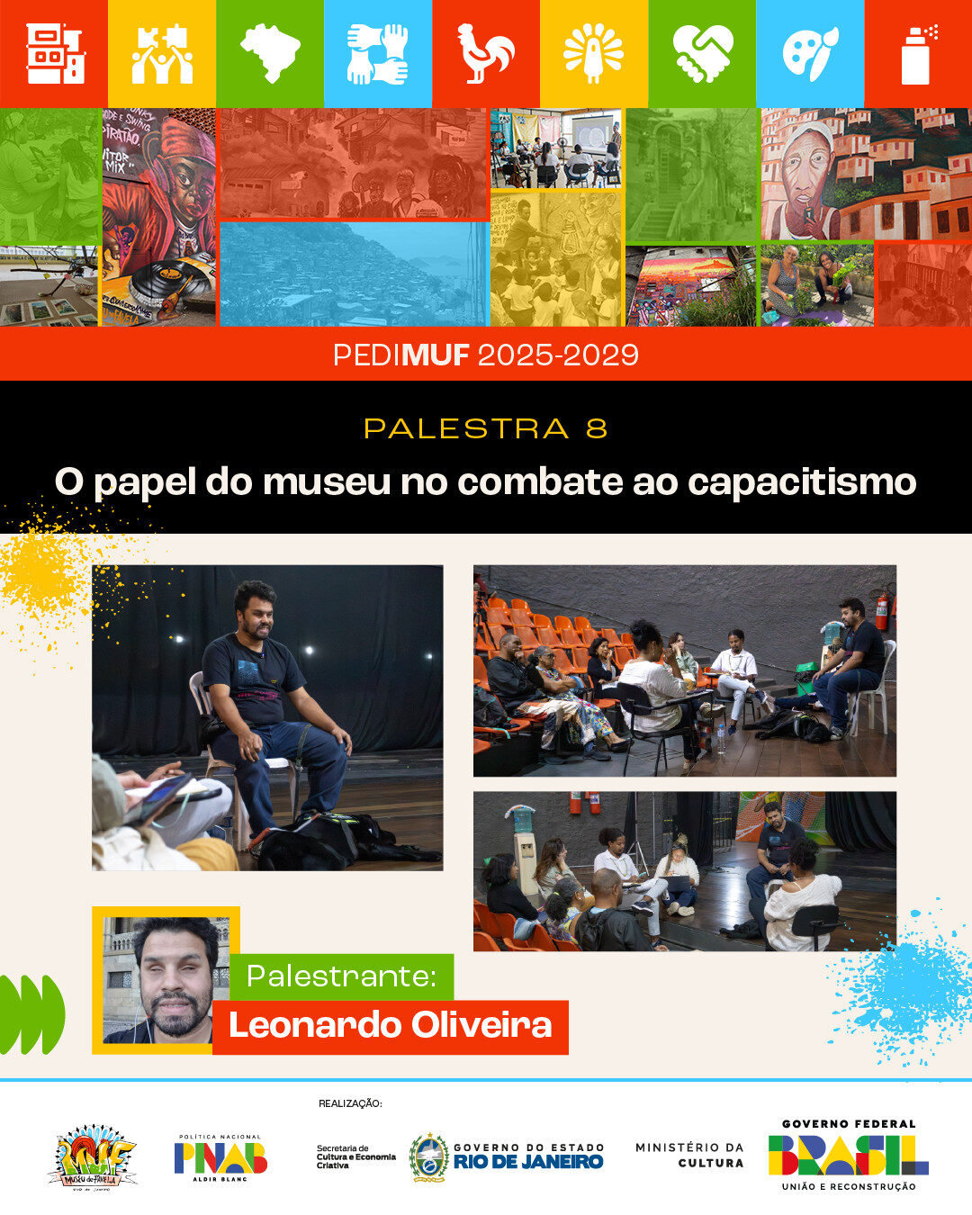 Audiodescrição de um Carrossel com quatro cards da Palestra ministrada por Leonardo Oliveira. Em todos, no rodapé, constam os logotipos do MUF- Museu de Favela, da PNAB- Política Nacional Aldir Blanc, e das instituições responsáveis pela realização: Secretaria de Cultura e Economia Criativa do Estado do Rio de Janeiro, Governo do Estado do Rio de Janeiro, Ministério da Cultura e Governo Federal: União e Reconstrução. 1- O cartaz é colorido, dividido em três blocos horizontais. No bloco superior há, uma faixa horizontal com 9 ícones quadrados coloridos: casas sobrepostas, três pessoas que aproximam duas peças de um quebra cabeça, o mapa do Brasil, mãos unidas que formam um quadrado, um galo, um pavão, mãos unidas formando um coração, uma aquarela e um spray de tinta. Abaixo há um mosaico com fotos coloridas do território do Pavão Pavãozinho e Cantagalo, casas-tela pintadas em grafite, quadros, ações no museu com pessoas e cenas urbanas. Abaixo, em uma faixa estreita vermelha em letras brancas, lê-se: PEDIMUF 2025 a 2029. No bloco central, há uma faixa preta. Em letras amarelas, lê-se: Palestra 8. Em letras brancas: O papel do museu no combate ao capacitismo. Abaixo, estão quatro fotos: 1- Fotografia de Leonardo sentado em uma cadeira plástica branca, sobre um palco com piso de madeira. Ele é um homem branco, de cabelos escuros, ondulados e volumosos, cego, barba curta e bigode pretos. Usa uma camiseta preta com estampa colorida na parte frontal e calça jeans azul. Exibe um sorriso discreto. Aos pés de Leonardo, está deitado um cão-guia. À frente, vê-se parcialmente outras pessoas sentadas. 2- Fotografia capturada à direita do palco, de oito pessoas sentadas em círculo no interior de um teatro. À esquerda, há fileiras de cadeiras fixas na cor laranja, dispostas em degraus, onde quatro pessoas estão sentadas. Mais ao centro, duas pessoas ocupam cadeiras de madeira, e à direita está Leonardo. Ao lado dele, vista parcialmente, está outra pessoa sentada no chão do palco. 3- Fotografia capturada de frente para o palco, mostrando o mesmo grupo retratado na imagem anterior. A pessoa sentada ao lado de Leonardo, está com a cabeça baixa e escreve em um notebook apoiado sobre as pernas. O espaço possui piso de madeira e fundo escuro. Na parede lateral esquerda, estão dois extintores de incêndio e um bebedouro alto de cor clara. 4-Na área inferior esquerda, está a foto do palestrante, visto dos ombros para cima. Ele usa uma camiseta preta e fones de ouvido brancos. Ao fundo, desfocada, está a fachada de um prédio histórico em pedra, com colunas brancas. À direita da foto, há duas faixas, uma verde e outra vermelha. Na faixa verde, em letras brancas, lê-se: Palestrante. Na vermelha, também em letras brancas: Leonardo Oliveira. 2- Sobre um fundo bege, há, na área superior direita e em diagonal, uma faixa vermelha onde se lê, em letras brancas: PEDIMUF. Abaixo, há duas fotografias dispostas verticalmente. A imagem superior retrata o grupo de oito pessoas posando sobre o palco. Ao centro, está Leonardo, sentado na cadeira plástica branca. À frente dele, o cão-guia preto está deitado. Atrás de Leonardo, cinco pessoas estão em pé, lado a lado, e outra está agachada, com o joelho direito apoiado no chão. Todos sorriem. Na fotografia inferior, o grupo está sentado. À direita, próxima a Leonardo, está uma senhora em pé. Ela usa um vestido estampado e segura uma garrafinha de água 3- Sobre um fundo bege, há, na área superior direita e em diagonal, uma faixa vermelha onde se lê, em letras brancas: PEDIMUF. Abaixo, está a fotografia de Leonardo, sentado na cadeira plástica branca, com a alça guia do cão preto apoiada sobre a coxa esquerda. 4- Sobre fundo bege, há, na área superior direita e em diagonal, uma faixa vermelha onde se lê, em letras brancas: PEDIMUF. À esquerda há a foto ao ar livre de Leonardo Oliveira que é visto do peito para cima. Leonardo é um homem branco, cabelos escuros, ondulados e volumosos, cego, barba curta e bigode pretos. Usa camisa preta e fones de ouvido brancos. Ao fundo, desfocada, está a fachada de um prédio histórico em pedra, com colunas brancas. À direita da foto, há duas faixas, uma verde e outra vermelha. Na faixa verde, em letras brancas, lê-se: Palestrante. Na vermelha, também em letras brancas: Leonardo Oliveira. Abaixo, lê-se: Leonardo Oliveira é membro da Coordenação de Equidade, Diversidade, Inclusão e Políticas Afirmativas da Fiocruz, onde atua na dimensão de formação. Palestrante, trabalha como consultor em acessibilidade e em audiodescrição. Participou como coautor na elaboração de artigos publicados em livros e revistas dedicados ao tema da acessibilidade cultural. Leonardo também é músico, instrumentista, cantor e compositor, tendo realizado pequenos trabalhos também nessa área. Fim da audiodescrição. |