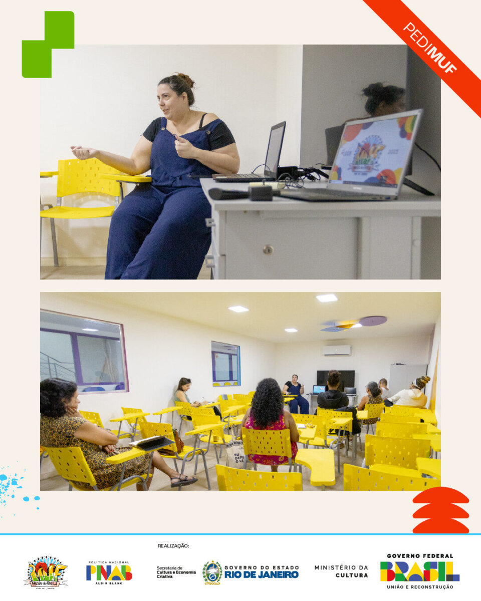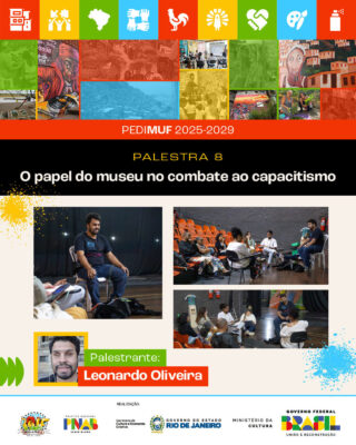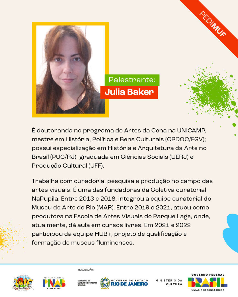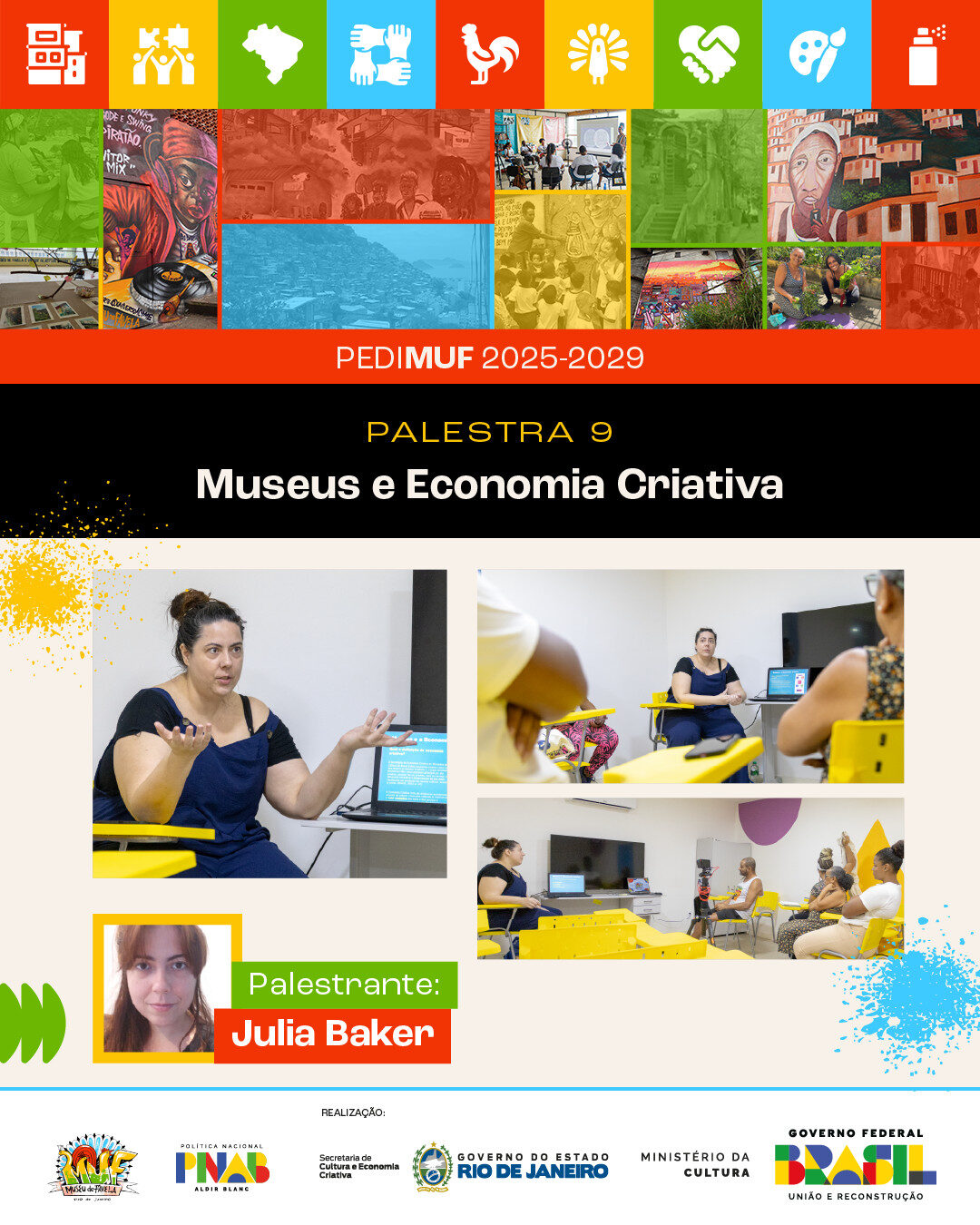 | Audiodescrição de um Carrossel com quatro cards da Palestra ministrada por Julia Baker. Em todos, no rodapé, constam os logotipos do MUF- Museu de Favela, da PNAB- Política Nacional Aldir Blanc, e das instituições responsáveis pela realização: Secretaria de Cultura e Economia Criativa do Estado do Rio de Janeiro, Governo do Estado do Rio de Janeiro, Ministério da Cultura e Governo Federal: União e Reconstrução. 1- O cartaz é colorido, dividido em três blocos horizontais. No bloco superior há, uma faixa horizontal com 9 ícones quadrados coloridos: casas sobrepostas, três pessoas que aproximam duas peças de um quebra cabeça, o mapa do Brasil, mãos unidas que formam um quadrado, um galo, um pavão, mãos unidas formando um coração, uma aquarela e um spray de tinta. Abaixo há um mosaico com fotos coloridas do território do Pavão Pavãozinho e Cantagalo, casas-tela pintadas em grafite, quadros, ações no museu com pessoas e cenas urbanas. Abaixo, em uma faixa estreita vermelha em letras brancas, lê-se: PEDIMUF 2025 a 2029. No bloco central, há uma faixa preta. Em letras amarelas, lê-se: Palestra 9. Em letras brancas: Museus e Economia Criativa. Abaixo, estão quatro fotos: 1- Julia Baker é uma mulher branca, de cabelos escuros presos em um coque. Possui sobrancelhas finas, olhos grandes e lábios delicados. Está sentada em uma cadeira amarela, com as mãos à frente do corpo, voltadas para cima. Usa uma camisa preta e um macacão azul. Júlia olha para frente. Ao lado dela, há uma mesa branca com um notebook aberto, cuja tela azul exibe texto em letras brancas. 2- Julia está sentada em frente a um grupo de pessoas, visto parcialmente, posicionada ao lado de uma mesa branca. Na tela do notebook sobre a mesa, vê-se um fundo azul com elementos coloridos. Atrás dela, há uma grande tela desligada. 3- Fotografia capturada à esquerda, ao fundo da sala onde Julia ministra a palestra. Ela está sentada ao lado de um notebook. À frente, três pessoas olham na direção dela e uma quarta, está virada para a direita com o braço erguido. No centro da sala, há uma câmera posicionada sobre um tripé. As paredes à direita são brancas, decoradas com formas coloridas em tons de roxo e amarelo. 4-Na área inferior esquerda, está a foto da palestrante, vista dos ombros para cima. Júlia está com cabelos mais claros e olha fixo para frente. À direita, sobre um fundo verde e em letras brancas, lê-se: Palestrante: Abaixo, sobre um fundo vermelho em letras brancas está o nome: Julia Baker. 2- Sobre um fundo bege, há, na área superior direita e em diagonal, uma faixa vermelha onde se lê, em letras brancas: PEDIMUF. Abaixo, duas fotografias retangulares estão dispostas verticalmente, uma acima da outra. Na imagem superior, Julia está sentada ao lado da mesa com dois notebooks abertos; em um deles, vê-se o logotipo do Museu da Favela. Julia sorri discretamente. Na imagem inferior, Júlia fala para um grupo de sete pessoas sentadas à frente dela. 3- Sobre um fundo bege, há, na área superior direita e em diagonal, uma faixa vermelha onde se lê, em letras brancas: PEDIMUF. Dez pessoas posam sorridentes para a foto em uma sala clara. Seis estão em pé ao fundo, com Julia Baker entre elas, e quatro estão agachadas à frente. Ao fundo, vê-se uma parede branca com um aparelho de ar-condicionado. 4- Sobre fundo bege, há, na área superior esquerda, uma foto de Júlia, vista dos ombros para cima. À direita da foto, há duas faixas, uma verde e outra vermelha. Na faixa verde, em letras brancas, lê-se: Palestrante. Na vermelha, também em letras brancas: Julia Baker. Na área superior direita, em diagonal, há uma faixa vermelha onde se lê, em letras brancas: PEDIMUF. Abaixo estão os textos, em letras pretas: É doutoranda no programa de Artes da Cena na UNICAMP, mestre em História, política e Bens Culturais (CPDOC/ FGV); possui especialização em História e Arquitetura da Arte no Brasil (PUC/RJ); graduada em Ciências Sociais (UERJ) e Produção Cultural (UFF). Trabalha na curadoria, pesquisa e produção no campo das artes visuais. É uma das fundadoras da Coletiva curatorial NaPupila. Entre 2013 e 2018, integrou a equipe curatorial do Museu de Arte do Rio (MAR). Entre 2019 e 2021, atuou como produtora na Escola de Artes Visuais do Parque Lage, onde, atualmente, dá aula em cursos livres. Em 2021 e 2022 participou da equipe HUB mais, projeto de qualificação e formação de museus fluminenses. Fim da audiodescrição |