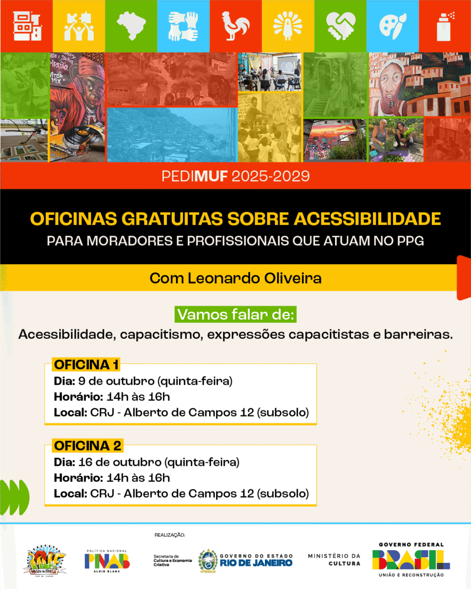 O Museu de Favela convida para duas oficinas de acessibilidade, abertas aos moradores, aos profissionais que atuam no PPG e ao público em geral. Quem conduzirá as oficinas será o profissional Leonardo Oliveira, consultor de acessibilidade.