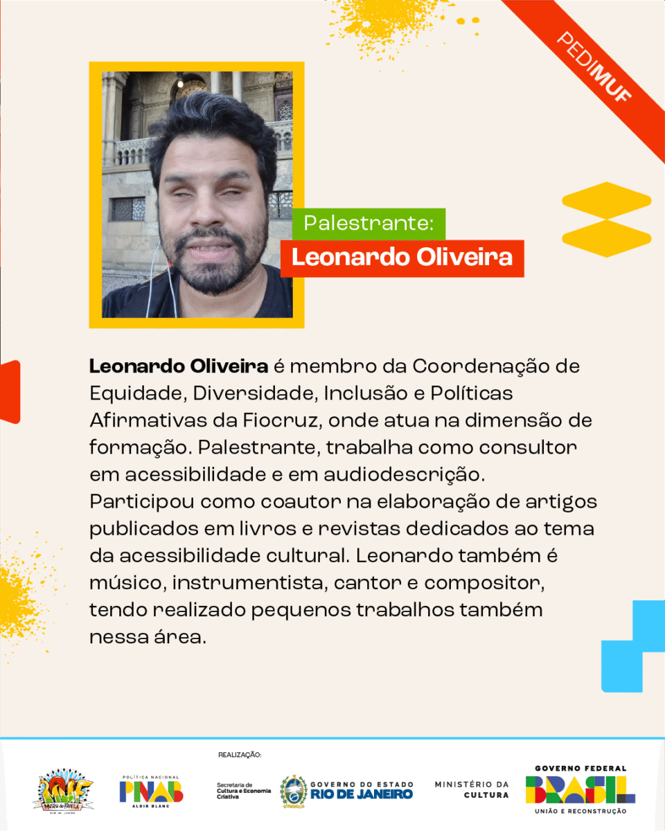 Audiodescrição de um Carrossel com dois cartazes de divulgação da Palestra ministrada por Leonardo Oliveira. Em todos, no rodapé, constam os logotipos do MUF- Museu de Favela, da PNAB- Política Nacional Aldir Blanc, e das instituições responsáveis pela realização: Secretaria de Cultura e Economia Criativa do Estado do Rio de Janeiro, Governo do Estado do Rio de Janeiro, Ministério da Cultura e Governo Federal: União e Reconstrução. 1- O cartaz é colorido, dividido em três blocos horizontais. No bloco superior há, uma faixa horizontal com 9 ícones quadrados coloridos: casas sobrepostas; três pessoas que aproximam duas peças de um quebra cabeça; o mapa do Brasil; mãos unidas que formam um quadrado; um galo; um pavão; mãos unidas formando um coração; uma aquarela e um spray de tinta. Abaixo há um mosaico com fotos coloridas do território do Pavão Pavãozinho e Cantagalo, casas-tela pintadas em grafite, quadros, ações no museu com pessoas e cenas urbanas. Abaixo, em uma faixa estreita vermelha em letras brancas, lê-se: PEDIMUF 2025 a 2029. No bloco central, há uma faixa preta com os dizeres em letras amarelas: Oficinas gratuitas sobre acessibilidade. Em letras brancas, lê-se: Para moradores e profissionais que atuam no PPG. Abaixo, em uma faixa estreita amarela e em letras pretas: Com Leonardo Oliveira.Abaixo, estão os textos: Vamos falar de: Acessibilidade, capacitismo, expressões capacitistas e barreiras. Oficina 1: Dia 9 de outubro (quinta-feira); Horário das 14 às 16 horas; Local: CRJ- Alberto de Campos 12 (Subsolo). Oficina 2: Dia 16 de outubro (quinta-feira); Horário: das 14 às 16 horas. Local: CRJ- Alberto de Campos 12 (Subsolo) 2-Sobre fundo bege, há, na área superior direita e em diagonal, uma faixa vermelha onde se lê, em letras brancas: PEDIMUF. À esquerda há a foto ao ar livre de Leonardo Oliveira que é visto do peito para cima. Leonardo é um homem branco, cabelos escuros, ondulados e volumosos, cego, barba curta e bigode pretos. Usa camisa preta e fones de ouvido brancos. Ao fundo, desfocada, está a fachada de um prédio histórico em pedra, com colunas brancas. À direita da foto, há duas faixas, uma verde e outra vermelha. Na faixa verde, em letras brancas, lê-se: Palestrante. Na vermelha, também em letras brancas: Leonardo Oliveira. Abaixo, lê-se: Leonardo Oliveira é membro da Coordenação de Equidade, Diversidade, Inclusão e Políticas Afirmativas da Fiocruz, onde atua na dimensão de formação. Palestrante, trabalha como consultor em acessibilidade e em audiodescrição. Participou como coautor na elaboração de artigos publicados em livros e revistas dedicados ao tema da acessibilidade cultural. Leonardo também é músico, instrumentista, cantor e compositor, tendo realizado pequenos trabalhos também nessa área. Fim da audiodescrição. |