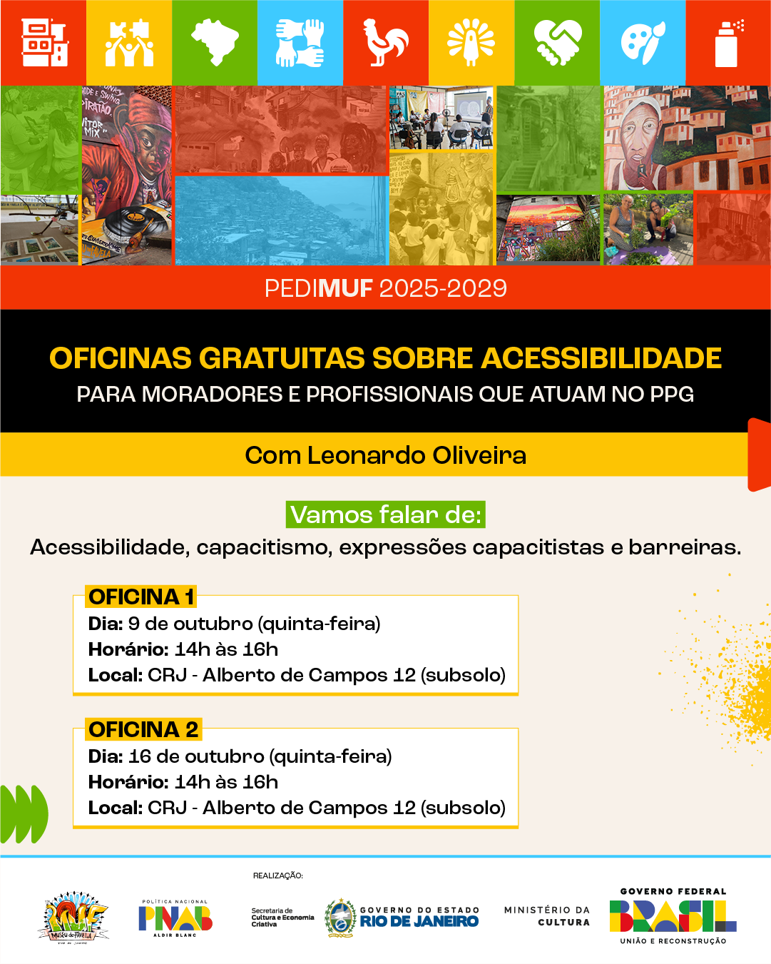 Audiodescrição de um Carrossel com dois cartazes de divulgação da Palestra ministrada por Leonardo Oliveira. Em todos, no rodapé, constam os logotipos do MUF- Museu de Favela, da PNAB- Política Nacional Aldir Blanc, e das instituições responsáveis pela realização: Secretaria de Cultura e Economia Criativa do Estado do Rio de Janeiro, Governo do Estado do Rio de Janeiro, Ministério da Cultura e Governo Federal: União e Reconstrução. 1- O cartaz é colorido, dividido em três blocos horizontais. No bloco superior há, uma faixa horizontal com 9 ícones quadrados coloridos: casas sobrepostas; três pessoas que aproximam duas peças de um quebra cabeça; o mapa do Brasil; mãos unidas que formam um quadrado; um galo; um pavão; mãos unidas formando um coração; uma aquarela e um spray de tinta. Abaixo há um mosaico com fotos coloridas do território do Pavão Pavãozinho e Cantagalo, casas-tela pintadas em grafite, quadros, ações no museu com pessoas e cenas urbanas. Abaixo, em uma faixa estreita vermelha em letras brancas, lê-se: PEDIMUF 2025 a 2029. No bloco central, há uma faixa preta com os dizeres em letras amarelas: Oficinas gratuitas sobre acessibilidade. Em letras brancas, lê-se: Para moradores e profissionais que atuam no PPG. Abaixo, em uma faixa estreita amarela e em letras pretas: Com Leonardo Oliveira.Abaixo, estão os textos: Vamos falar de: Acessibilidade, capacitismo, expressões capacitistas e barreiras. Oficina 1: Dia 9 de outubro (quinta-feira); Horário das 14 às 16 horas; Local: CRJ- Alberto de Campos 12 (Subsolo). Oficina 2: Dia 16 de outubro (quinta-feira); Horário: das 14 às 16 horas. Local: CRJ- Alberto de Campos 12 (Subsolo) 2-Sobre fundo bege, há, na área superior direita e em diagonal, uma faixa vermelha onde se lê, em letras brancas: PEDIMUF. À esquerda há a foto ao ar livre de Leonardo Oliveira que é visto do peito para cima. Leonardo é um homem branco, cabelos escuros, ondulados e volumosos, cego, barba curta e bigode pretos. Usa camisa preta e fones de ouvido brancos. Ao fundo, desfocada, está a fachada de um prédio histórico em pedra, com colunas brancas. À direita da foto, há duas faixas, uma verde e outra vermelha. Na faixa verde, em letras brancas, lê-se: Palestrante. Na vermelha, também em letras brancas: Leonardo Oliveira. Abaixo, lê-se: Leonardo Oliveira é membro da Coordenação de Equidade, Diversidade, Inclusão e Políticas Afirmativas da Fiocruz, onde atua na dimensão de formação. Palestrante, trabalha como consultor em acessibilidade e em audiodescrição. Participou como coautor na elaboração de artigos publicados em livros e revistas dedicados ao tema da acessibilidade cultural. Leonardo também é músico, instrumentista, cantor e compositor, tendo realizado pequenos trabalhos também nessa área. Fim da audiodescrição. |